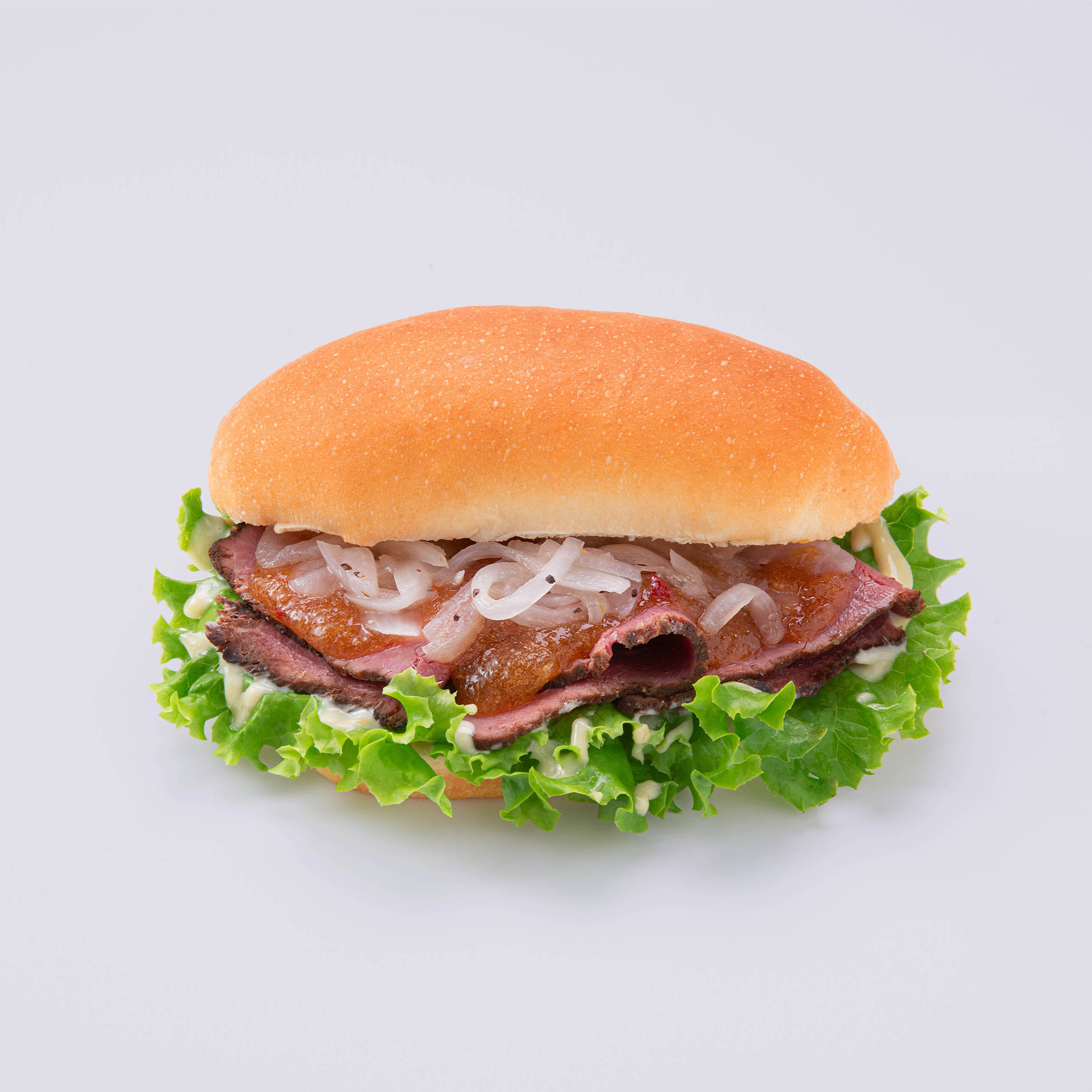 ローストビーフにおろしポン酢タレとわさびマヨネーズをかけて、国産玉ねぎマリネをサンドしています。