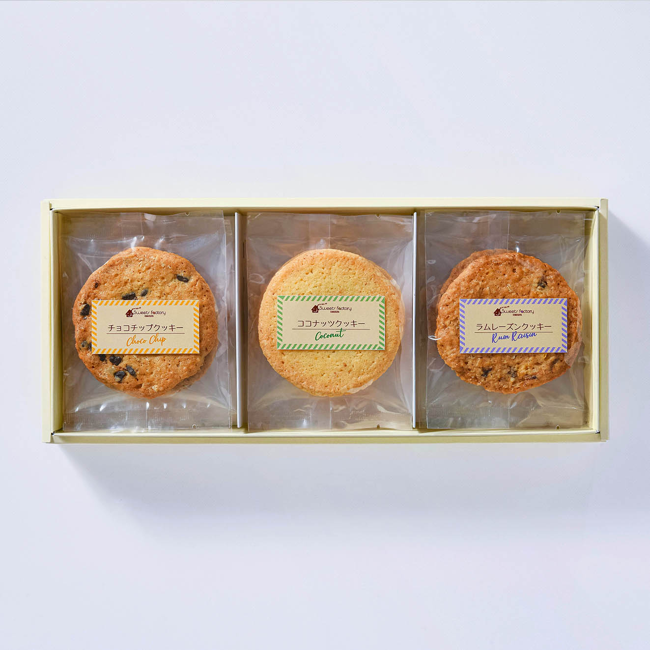 チョコチップ・ココナッツ・ラムレーズンの3種類の詰め合わせです。